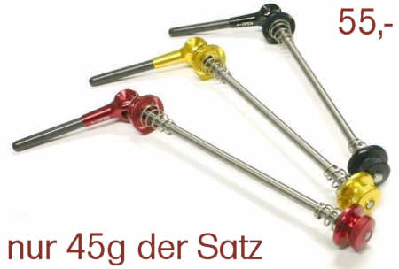 Superleichte Schnellspanner mit Titanachse, Alumuttern und Carbonhebel.